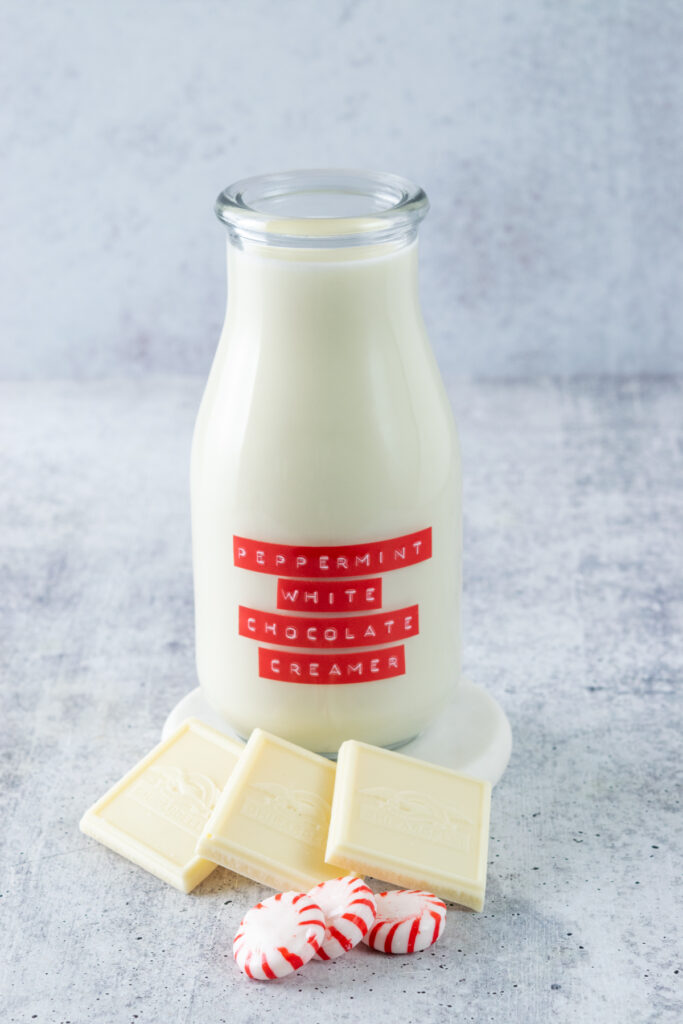 Add a splash of holiday flavor to your coffee with this ridiculously easy-to-make peppermint white chocolate creamer recipe. It comes together in just 5 minutes, and since it's made with real cream, it can be frothed or steamed for a quick, at-home peppermint white mocha.